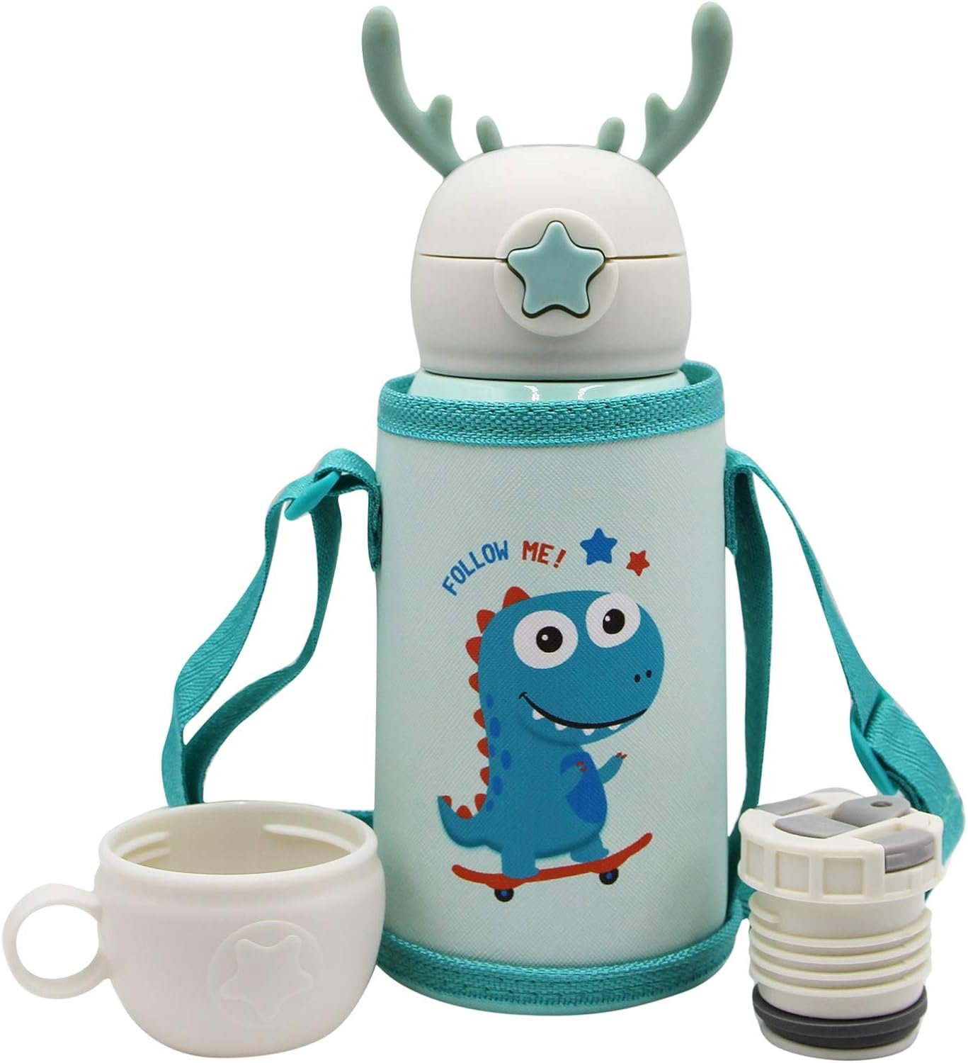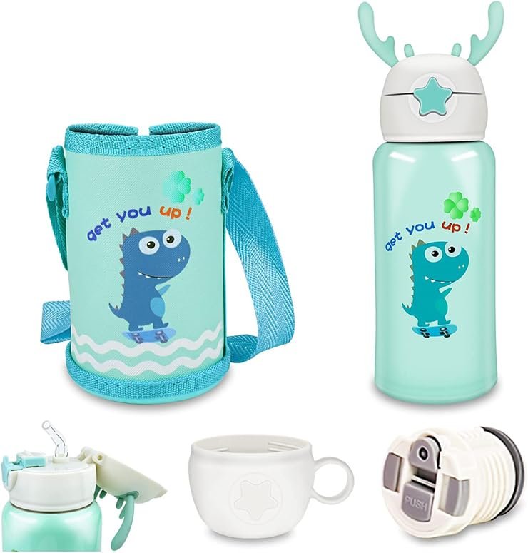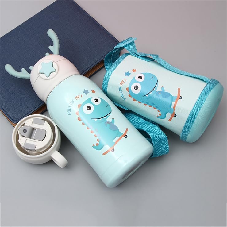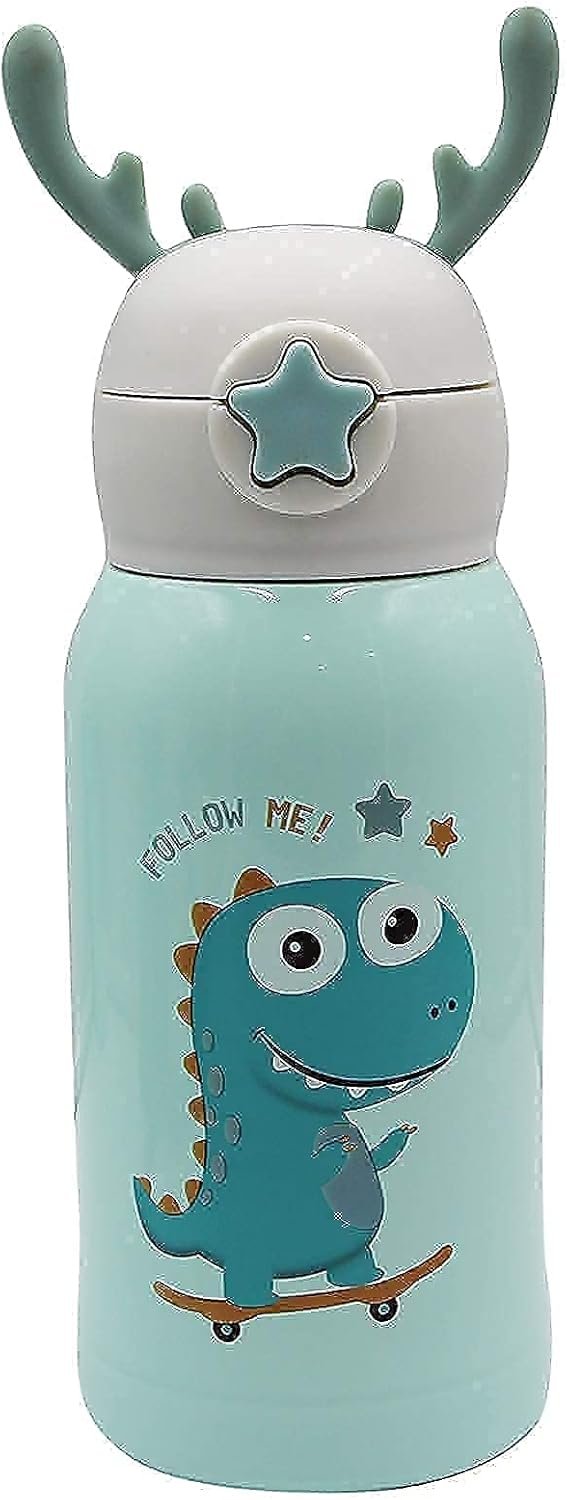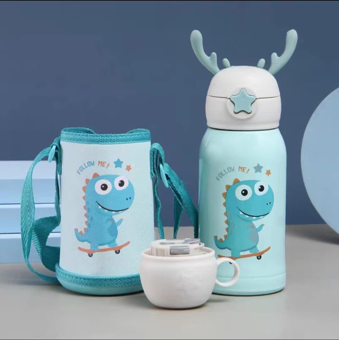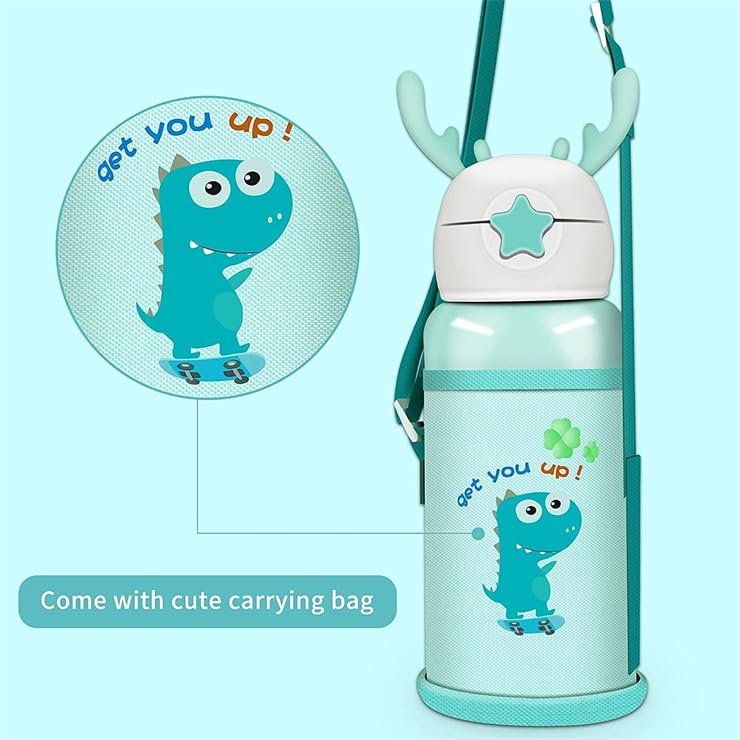 Keep your little ones hydrated in style with this Cute Dinosaur Kids Water Bottle with Strap. Designed with a fun cartoon dinosaur print and topped with adorable antler-style handles, this bottle is both practical and eye-catching.