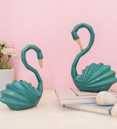 Bring charm and sophistication to your living space with this Elegant Swan Showpiece Set. Designed in a modern geometric style, these swan figurines feature a sleek green finish with golden beaks, making them the perfect blend of contemporary and classy decor.